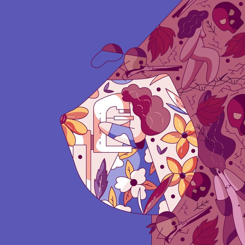 The composition centers around the shape of a breast, with a woman brightly illuminated as she looks into a microscope, symbolizing the pursuit of knowledge, research, and hope through vibrant, contrasting colors. In the shadowed section of the illustration, I depicted fearful women in muted tones of the same color, representing the understandable anxiety and uncertainty surrounding breast cancer.