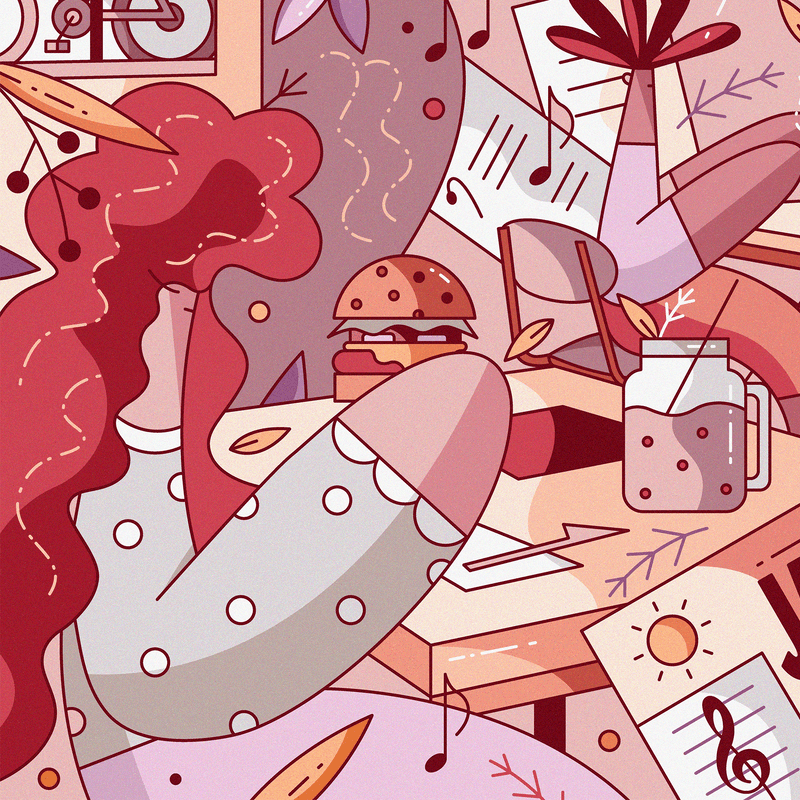 I combined these details with playful references to both coffee culture and live music, blending instruments, coffee, food, and cozy shop features into a lively composition that felt unmistakably theirs.