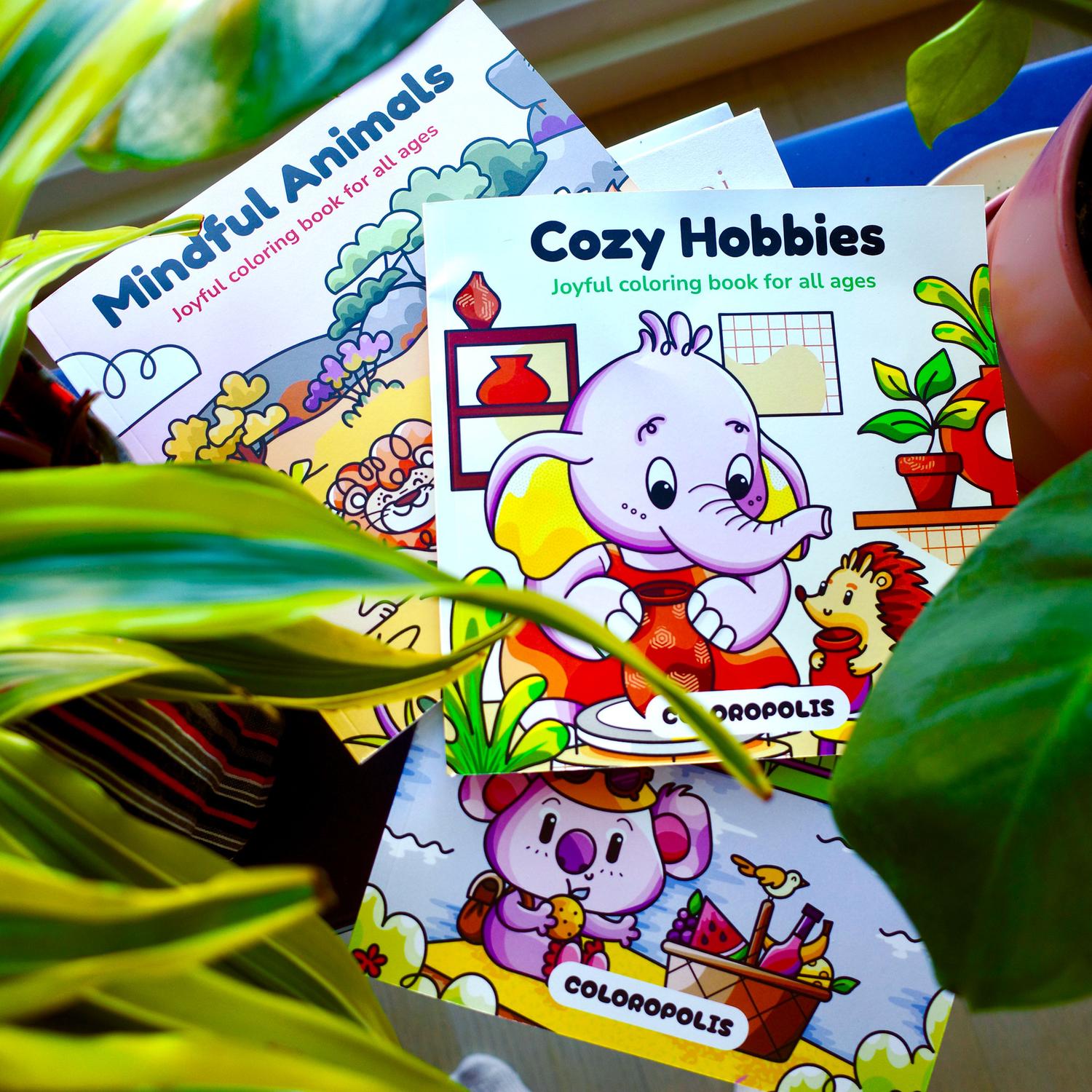 Building on the success of our individual coloring page sets, we brought together our favorite and most popular illustrations into three themed coloring books: Mindful Animals, Cozy Hobbies, and Furry Travelers.