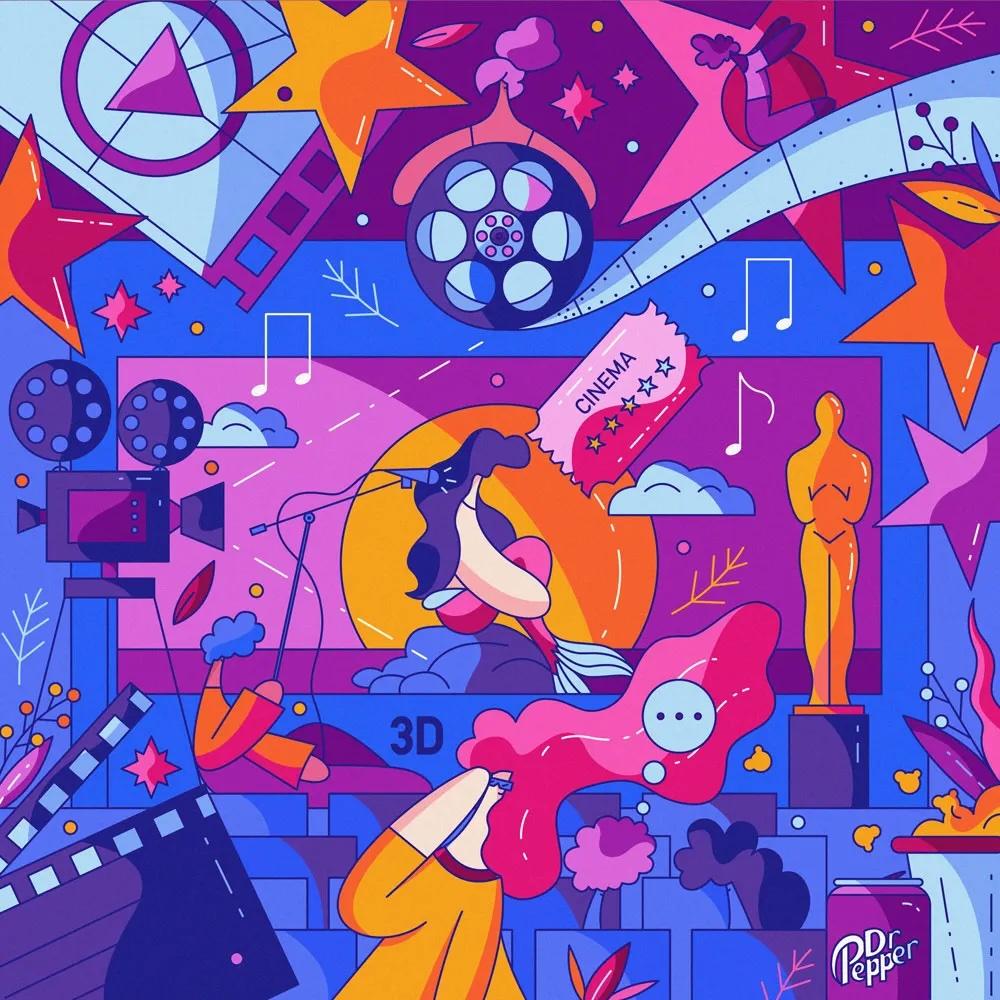 Each illustration includes iconic symbols and scenes related to its branch of art: film reels and spotlights for cinematography, stage and decorations for theater, mannequins and textiles for fashion, classical columns for architecture, etc. This set offers variety while maintaining a unified style.